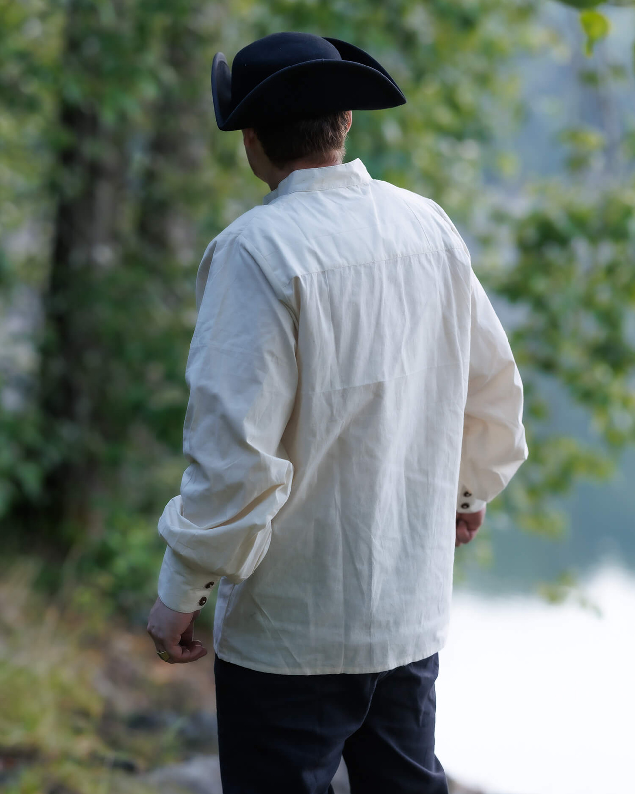 Koszula „Bartold” to połączenie prostoty, wygody i stylu inspirowanego dawnymi epokami. Jej klasyczny krój z krótką stójką sprawia, że świetnie komponuje się z różnymi rodzajami kostiumów – od prostych, chłopskich stylizacji po stroje kupców czy mieszczan. Naturalne guziki z kokosa dodają jej autentycznego, rustykalnego uroku, a jednocześnie czynią każdy egzemplarz nieco unikalnym.