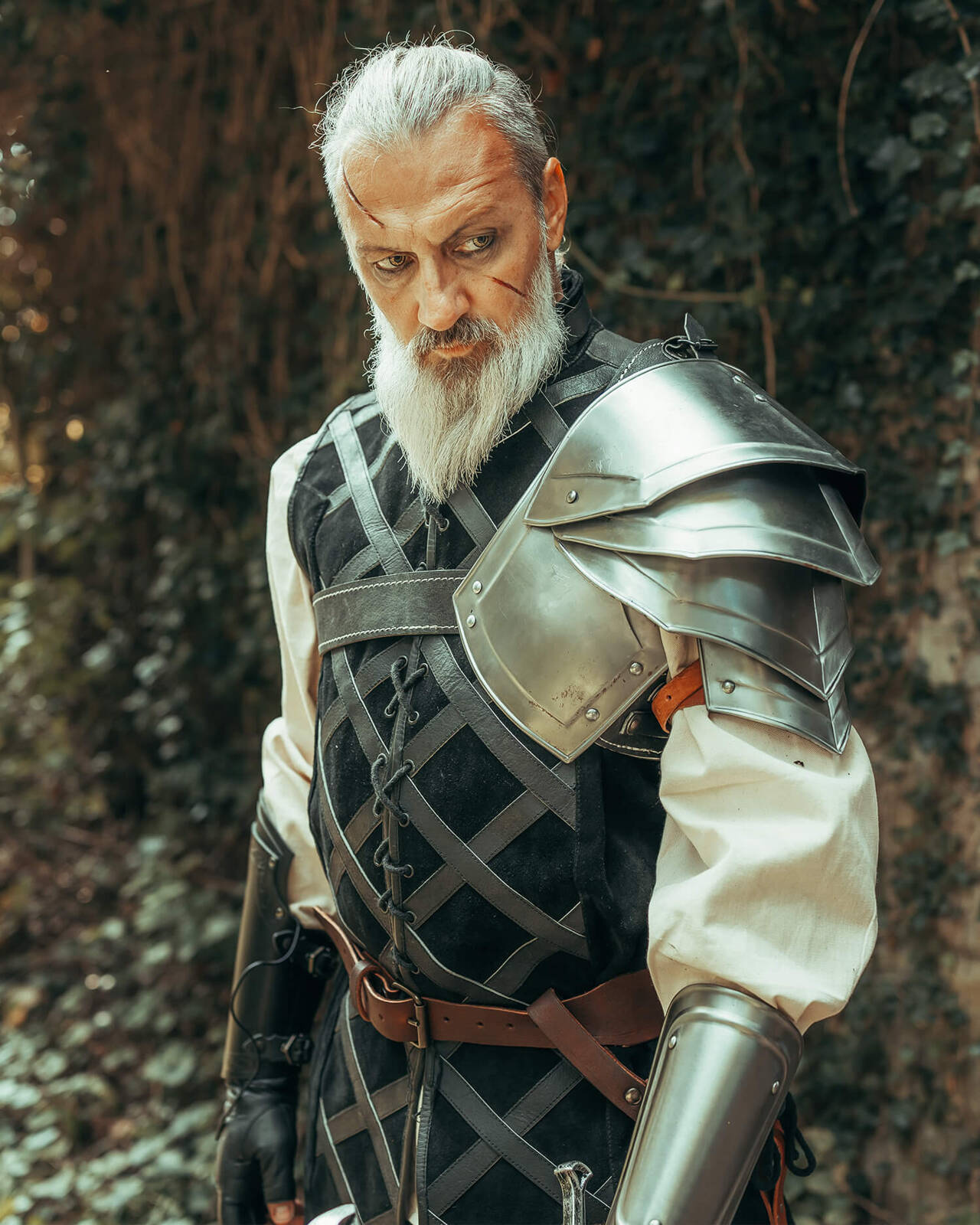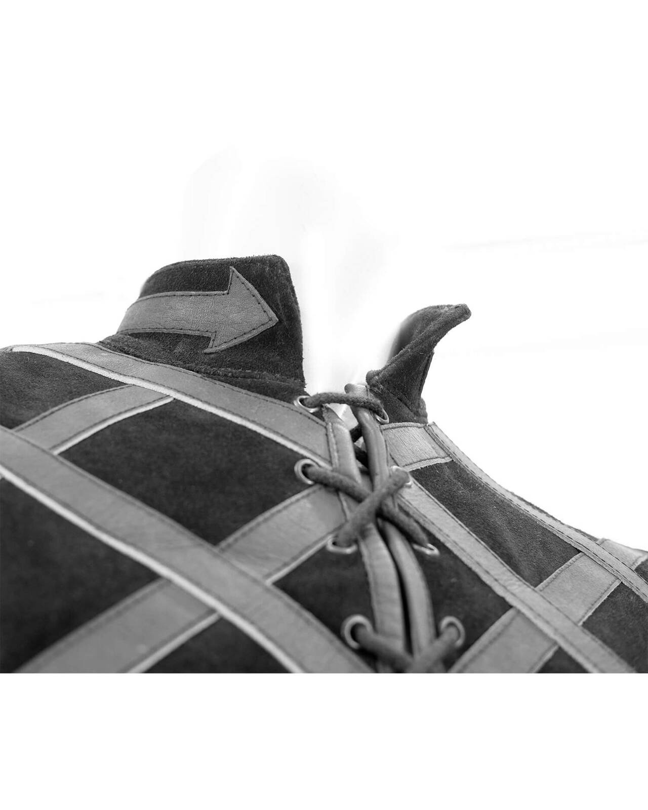Kamizelka „Cahir” wykonana z wysokogatunkowego zamszu to idealny wybór dla poszukiwaczy przygód, najemników i łowców potworów. Charakteryzuje się solidnym wykonaniem oraz dopracowanymi detalami, takimi jak ukośne przeszycia na skórzanych wzmocnieniach z przodu oraz subtelne zdobienia kołnierza, które nadają jej wyrazisty wygląd. Dzięki sznurowaniu z przodu i po bokach można łatwo dopasować ją do sylwetki, co zapewnia wygodę i swobodę ruchów. Przemyślany design oraz staranne zdobienia sprawiają, że kamizelka „Cahir” doskonale sprawdzi się zarówno jako stylowa, trwała lekka zbroja skórzana, jak i wyróżniający się element stroju.