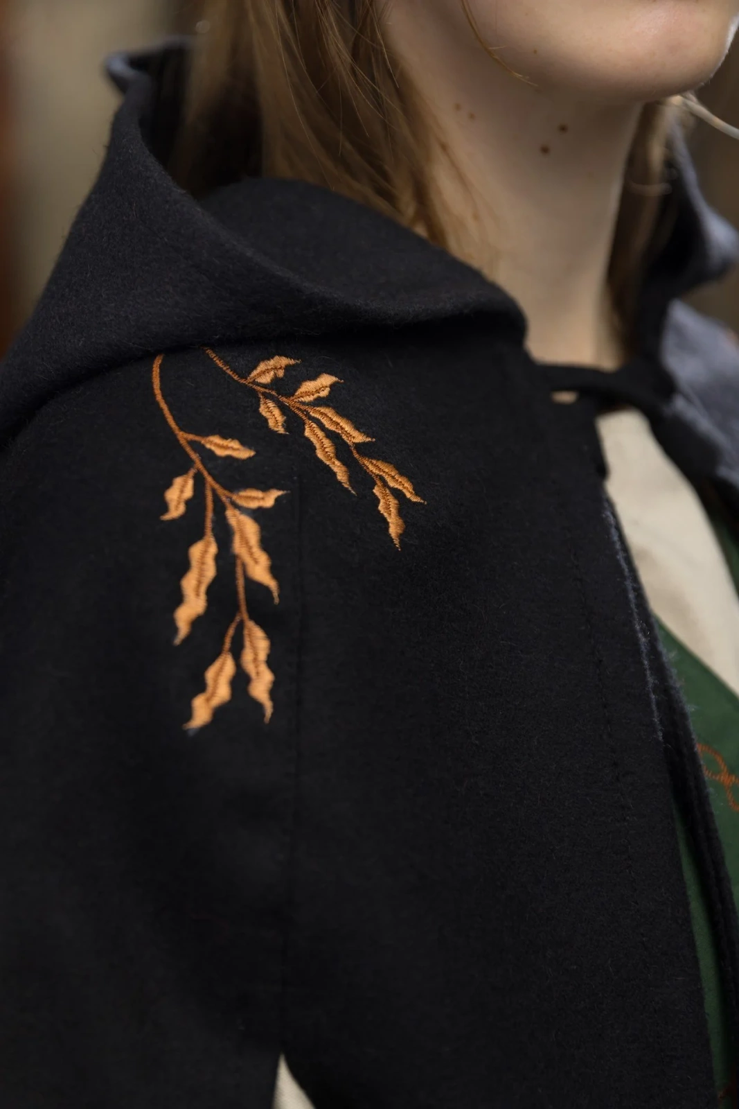 Elegancka, półdługa peleryna wykonana z ciepłego filcu wełnianego to doskonałe uzupełnienie stroju postaci dworskich, czarodziejek, zielarek lub pielgrzymów. Jej klasyczny krój z rozcięciami na ręce, długi, szpiczasty kaptur oraz subtelny, roślinny haft na ramionach nadają sylwetce wyjątkowego charakteru i szlachetnego wyglądu.