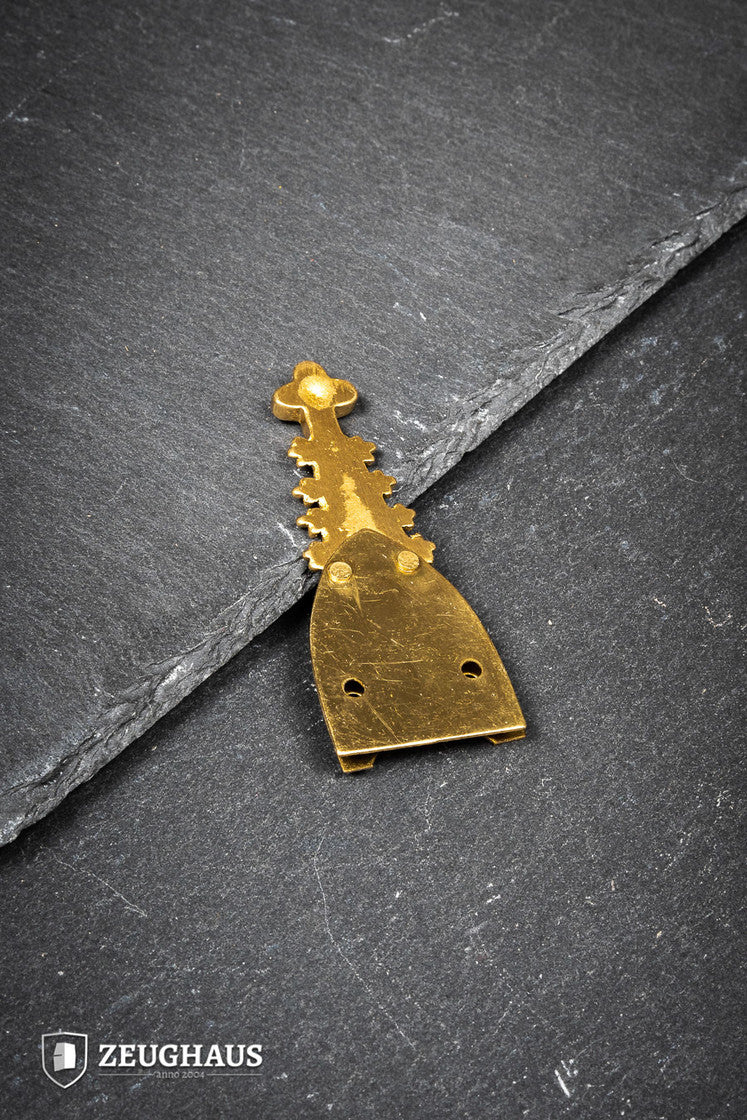 Clover Strap End - mosiężna końcówka pasa, na pas o szerokości 30mm i grubości 4mm. Aby go zamontować wystarczy zrobić dziurki pod nity i zaklepać młotkiem. Najlepiej przed zaklepaniem nóżki dodać podkładkę, aby zabezpieczyć przed wypadaniem.