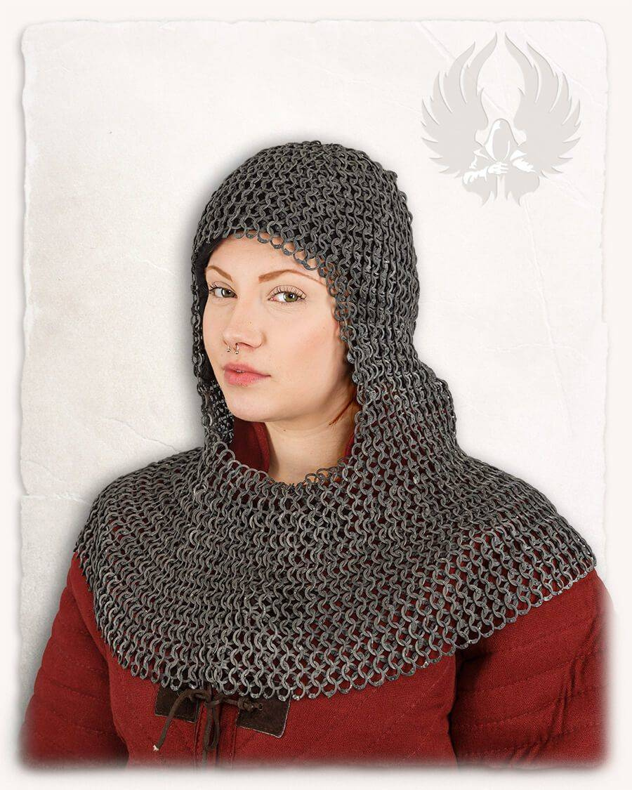 - Aluminium Chain Coif flat ring riveted - lekki kaptur kolczy z aluminiowych płaskich kółek w splocie 4w1 i nitowanych na łączeniach. Dostępny w trzech rozmiarach.