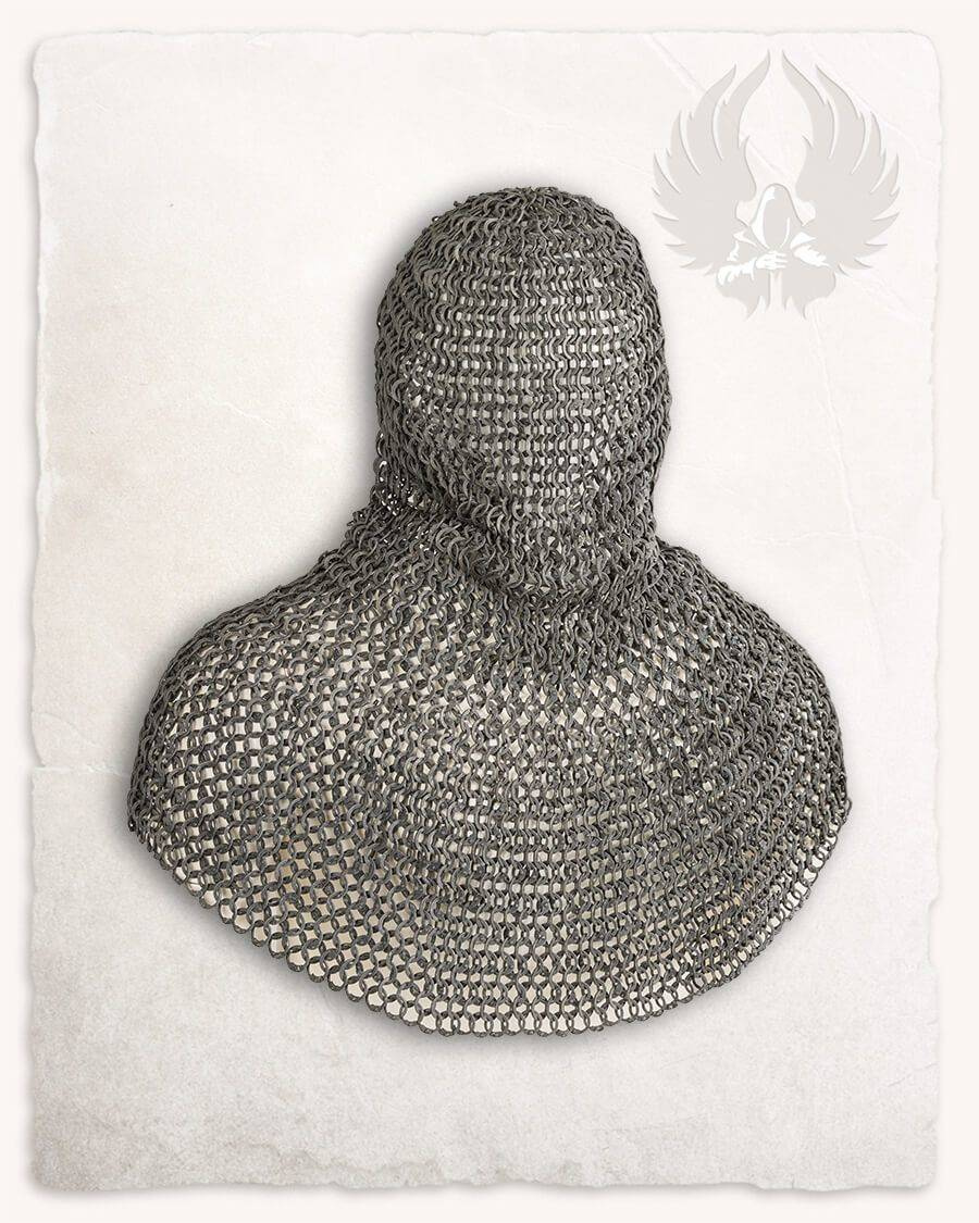 Lekki i trwały kaptur kolczy z aluminium. Splot typu 4w1 został wykonany z solidnych pierścieni aluminiowych, które są zanitowane. Kaptury dostępne są w trzech rozmiarach: David (S-M), Richard (L-XL) i Berengar (XXL) jako największy rozmiar. Aby jeszcze bardziej zwiększyć komfort, polecamy je w połączeniu z pikowanymi czepcami.