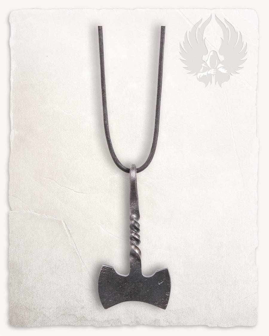 Mały wisiorek wykonany z kutego żelaza w kształcie podwójnego topora. Do wisiorka dołączony jest okrągły pasek z mocnej skóry, który można wykorzystać do noszenia go jako naszyjnik lub do przywiązania do paska lub sakiewki w celu ozdoby.