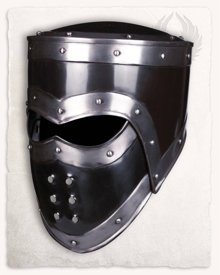 - Hełm: stylizowana przyciemniana stal (z uwagi na ręczne wykonanie poziom przyciemnienia jest różny, w praktyce najczęściej pancerze tego typu są zupełnie czarne). W środku malowany na czarno.