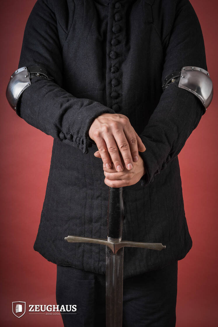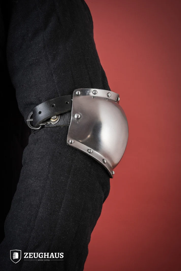Nałokietniki z XIV wieku, wykonane z 1,6 mm polerowanej stali, zapewniają skuteczną ochronę łokci. Mogą też być używane jako osłona kolan. Solidnie przymocowane skórzane paski i miękka skórzana wyściółka od wewnątrz gwarantują stabilność. Szerokość: ok. 12 cm