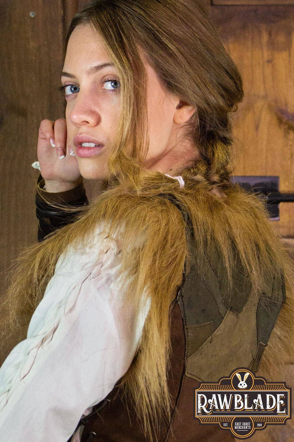 The Falcon Leather Jerkin is made of grey split leather, high quality patched leather and synthetic fur on the collar and shoulders. The closing system, with leather cord, is comfortable, easy and very resistant. Does not include the accessories shown in the photos.