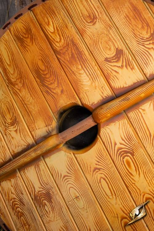 Okrągła w klasycznym stylu normańskim, stylizowana na drewnianą z żelaznym okuciem i wydatnym umbo. Uchwyt stanowi owinięty skórą imacz zamontowany na wysokości umba.