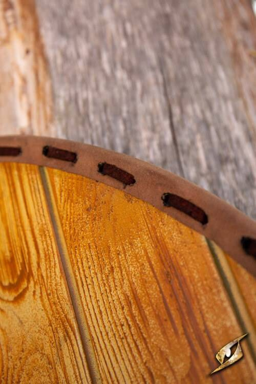 Okrągła w klasycznym stylu normańskim, stylizowana na drewnianą z żelaznym okuciem i wydatnym umbo. Uchwyt stanowi owinięty skórą imacz zamontowany na wysokości umba.