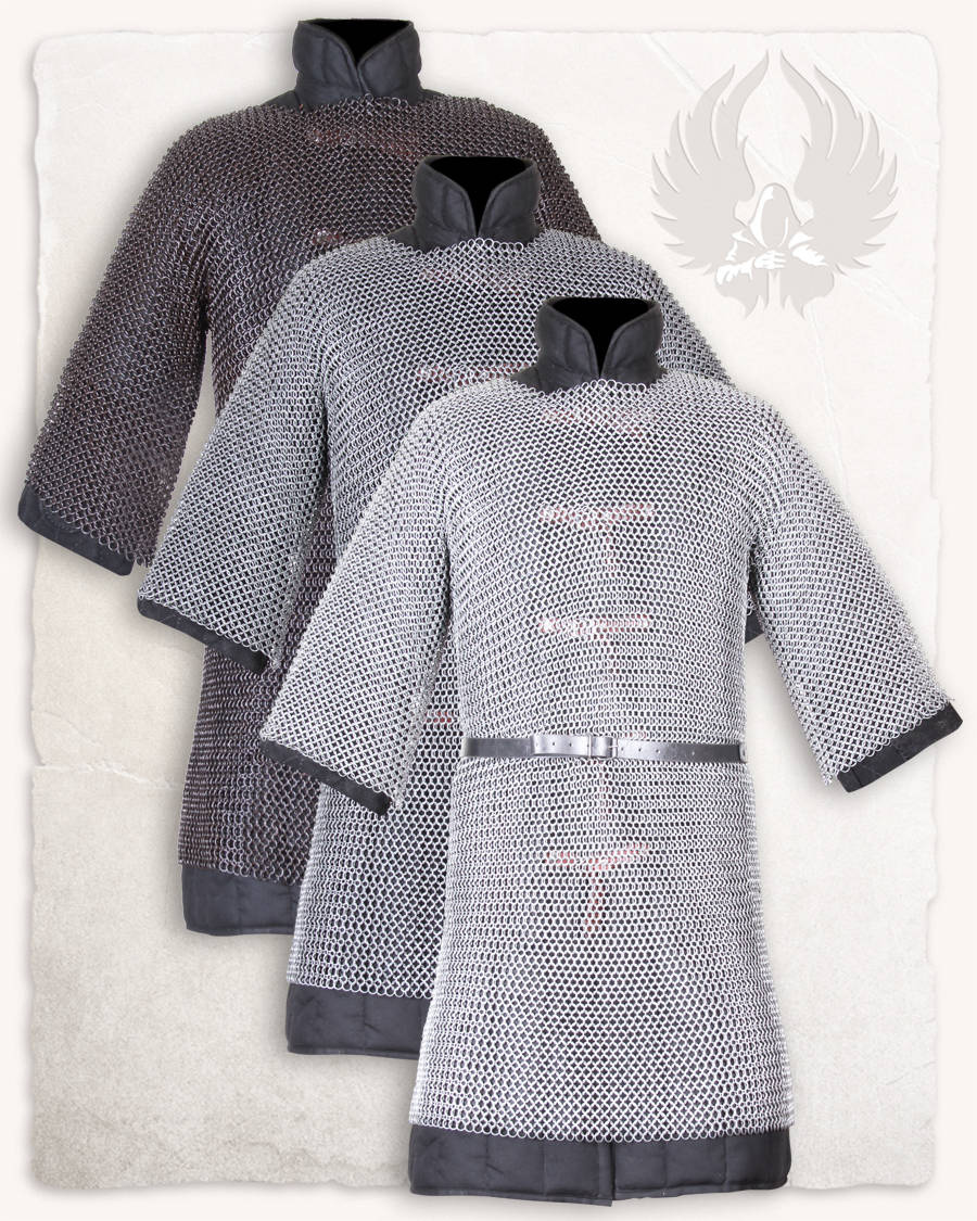 Kolczugi w kolorze stalowym są surowe, zabezpieczone przed rdzewieniem olejem maszynowym. Błyszczące są galwanizowane cynkiem, co oprócz połysku daje także bardzo dobrą ochronę przed rdzewieniem. Wersje przyciemniane powstają po obróbce kwasowej, co wprawdzie również chroni przed rdzą, ale wymaga częstego oliwienia. - Dobra jakość i wytrzymałość.