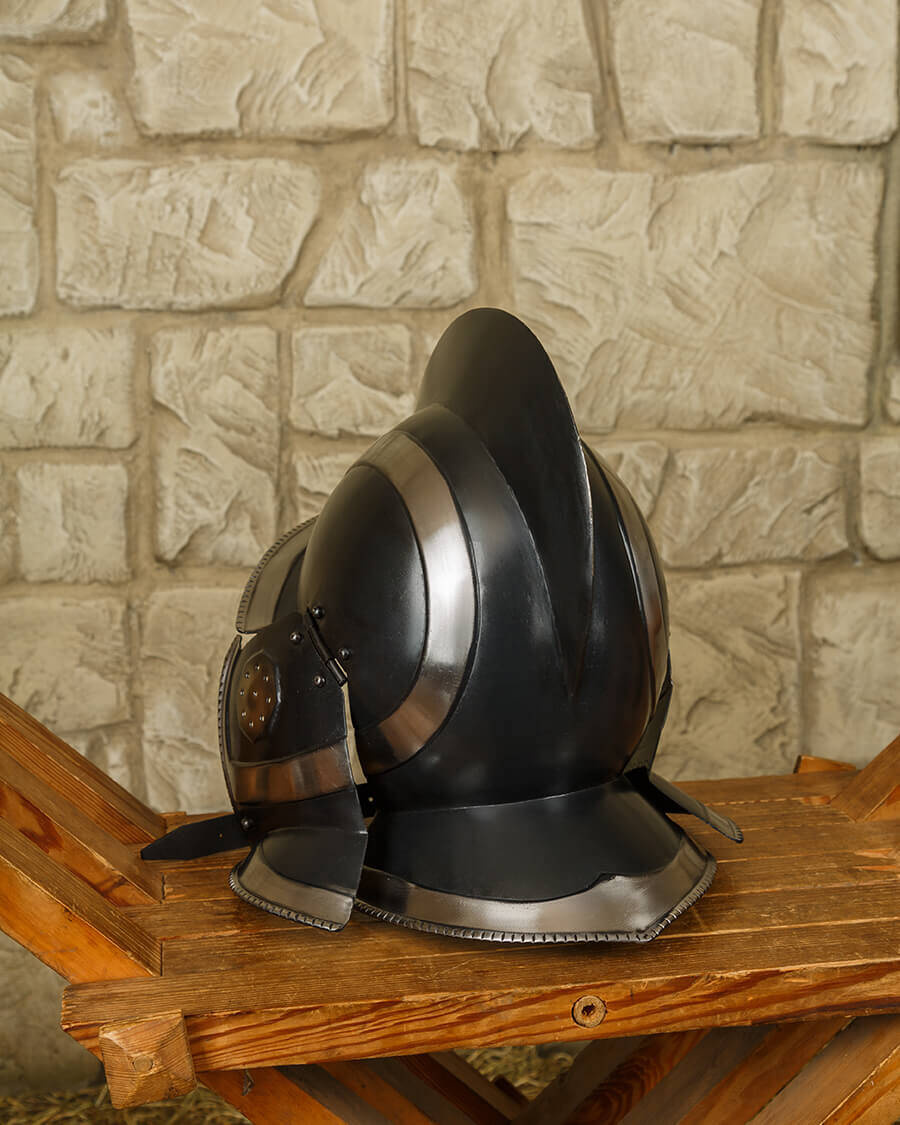 - Hełm: stylizowana przyciemniana stal (z uwagi na ręczne wykonanie poziom przyciemnienia jest różny, w praktyce najczęściej pancerze tego typu są zupełnie czarne). W środku malowany na czarno.