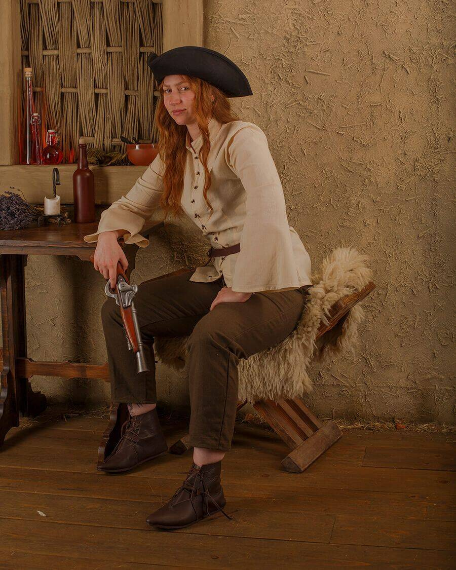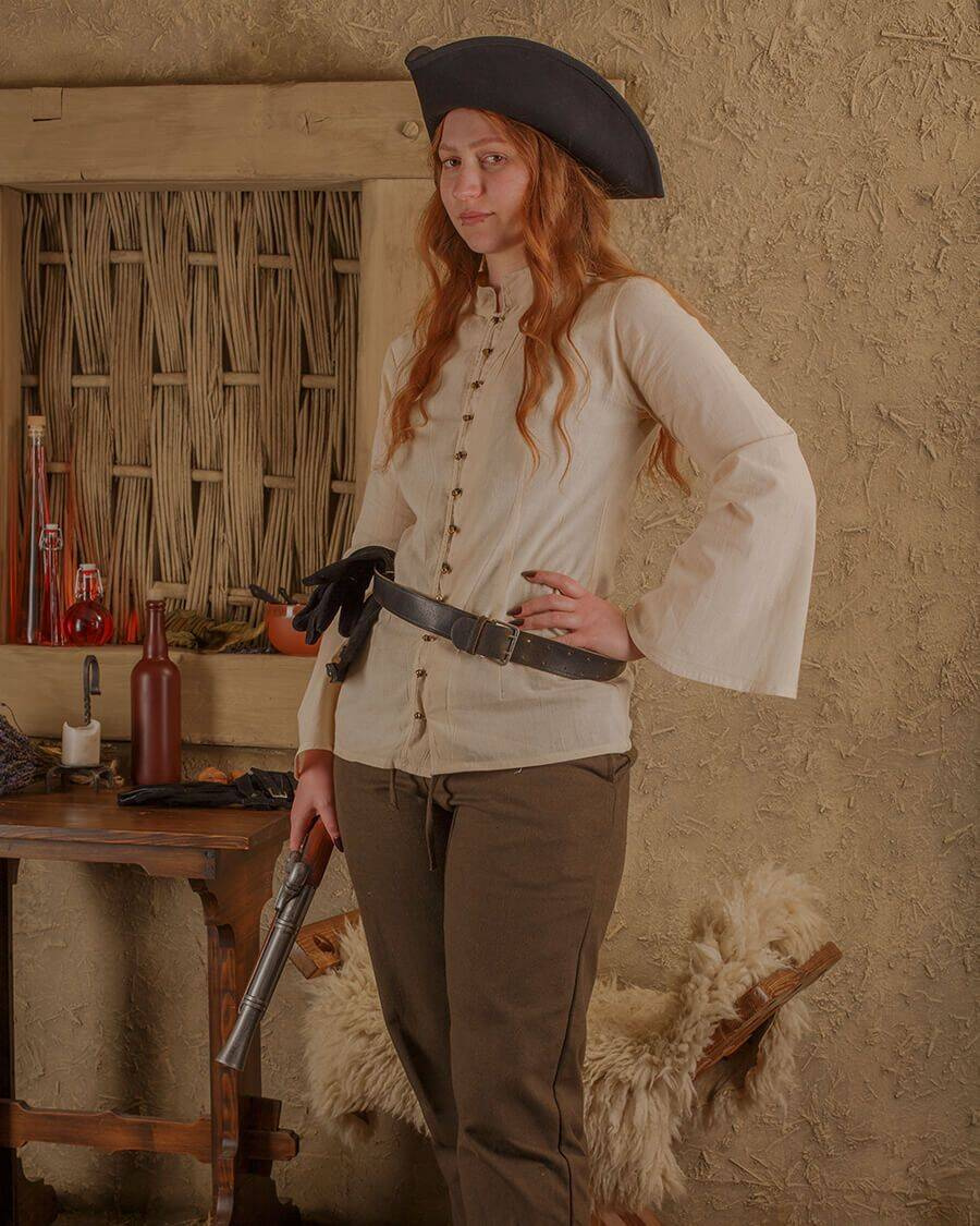 Bluzka Kassandra cechuje się unikalnymi metalowymi guzikami, które dodają jej surowego i spójnego charakteru, mimo swobodnego kroju i szerokich rękawów. Dzięki temu jest idealna do różnych stylizacji wymagających nieco bardziej formalnego wyglądu. Dodatkowo, jeśli zestawisz ją z spódnicą i gorsetem, zyska elegancki, kobiecy wygląd. Ta wszechstronna bluzka doskonale sprawdzi się również w kreacjach inspirowanych Azją, w strojach piratów, szlachty czy elfów.
