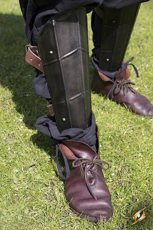 Drake - Pół-nagolenniki wykonane z galwanizowanej stali o grubości 1 mm. Zaokrąglone i nachodzące na boki łydek zostawiają miejsce na zamocowanie nakolanników. Sięgają poniżej kolana aż do kostek. Są umocowane na skórzanych lakowanych pasach. Nagolenniki są udekorowane wzorem przypominającym łuski. Z zewnątrz pancerz przyciemniono specjalnym barwnikiem.