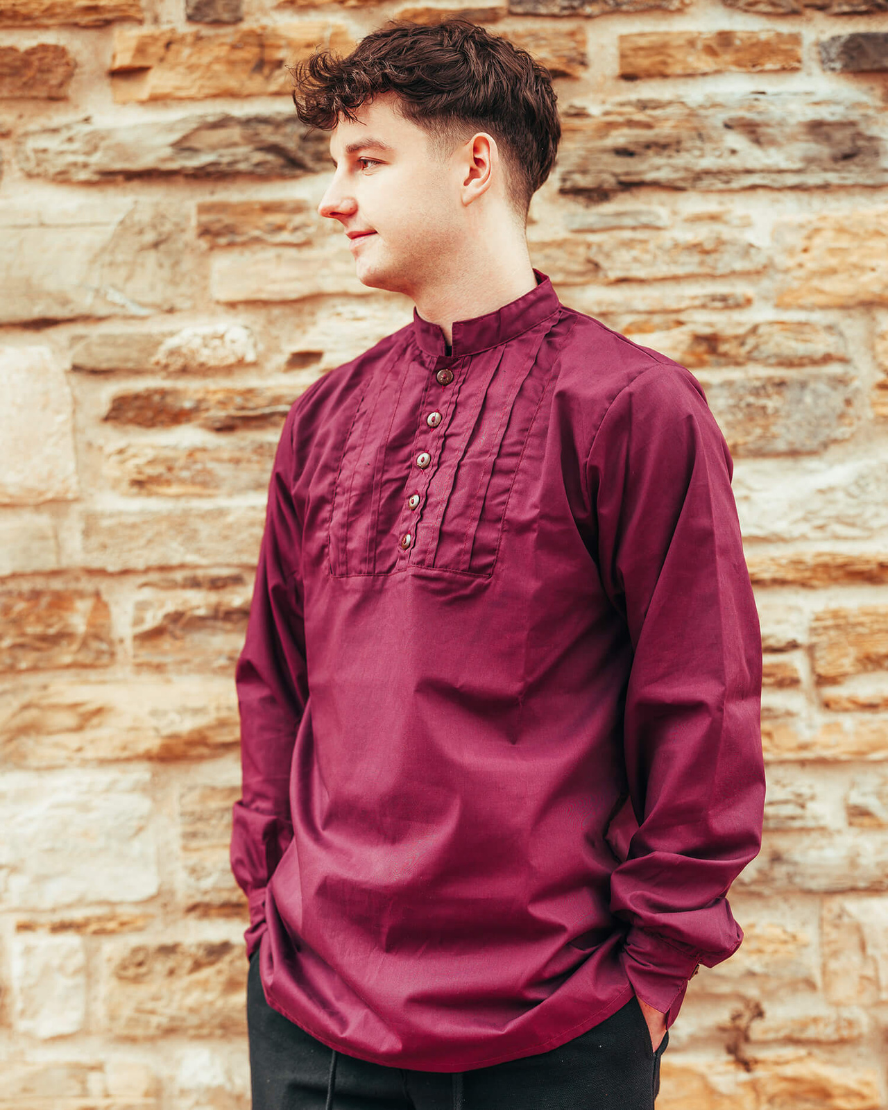Koszula „Lucious” łączy w sobie klasyczny styl z doskonałym dopasowaniem, czyniąc ją idealnym wyborem do eleganckich kreacji. Wykonana z wysokiej jakości bawełny, zapewnia autentyczny wygląd i komfort noszenia. Posiada stójkę oraz subtelne zapięcie z kokosowymi guzikami, a drobne plisowania nadają jej wyrafinowanego charakteru. Długie rękawy z mankietami zapinanymi na guziki pozwalają na różnorodne stylizacje – od klasycznych po bardziej współczesne. Dzięki swobodnemu krojowi gwarantuje pełną swobodę ruchów zarówno podczas eleganckich przyjęć, jak i dynamicznych scen walki.