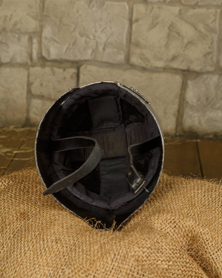 Hełm wykonany ze stali. Od środka pomalowano hełm na czarno, zabezpieczając go przed korozją.