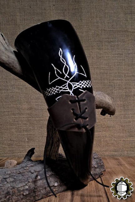 - New Blood Horn Holder - to solidny uchwyt pasowy z wytrzymałej skóry Crazy Horse. Regulowany, mieści róg do picia lub broń pionowo przy pasie, łącząc funkcjonalność z surowym, postarzoną estetyką