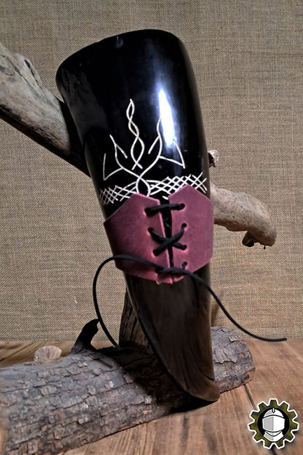 - New Blood Horn Holder - to solidny uchwyt pasowy z wytrzymałej skóry Crazy Horse. Regulowany, mieści róg do picia lub broń pionowo przy pasie, łącząc funkcjonalność z surowym, postarzoną estetyką