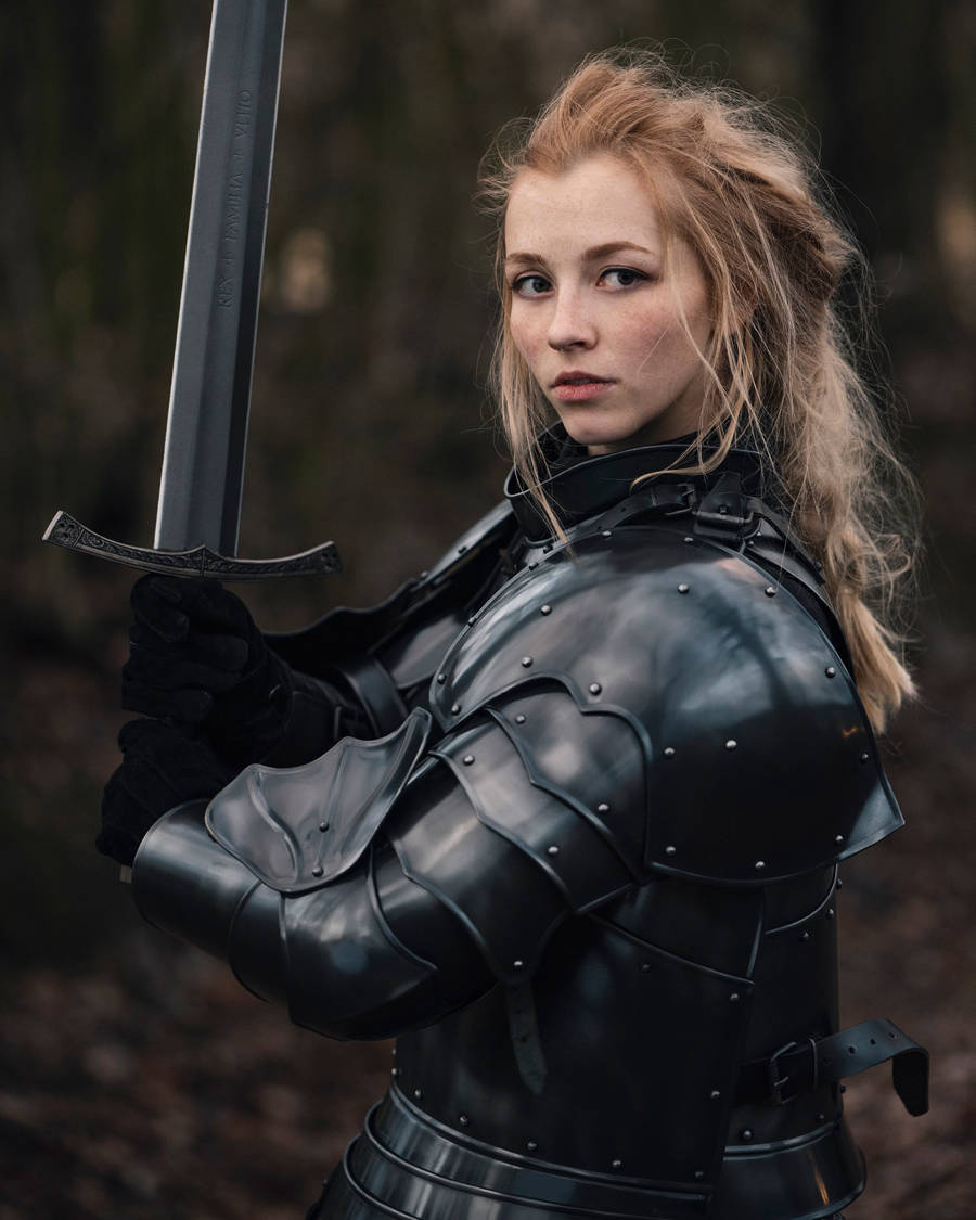- Pancerz: stylizowana przyciemniana stal (z uwagi na ręczne wykonanie poziom przyciemnienia jest różny, w praktyce najczęściej pancerze tego typu są zupełnie czarne). W środku malowany na czarno.