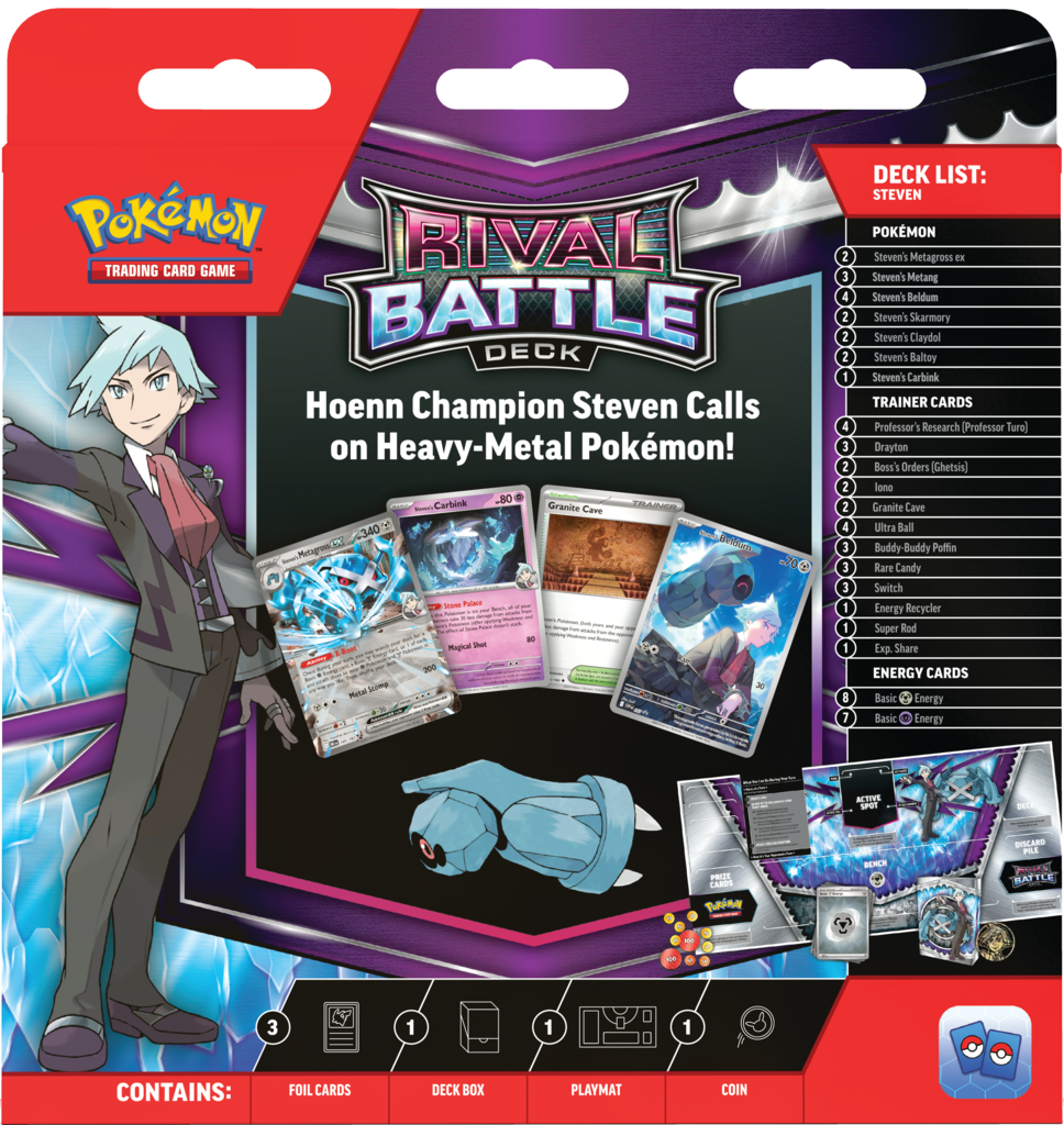 Potężne Pokémony ex są gotowe wkroczyć na pole bitwy wraz z nowymi deckami! Pokémon TCG: Rival Battle Deck Steven zawiera gotową talię 60 kart, przewodzoną przez tytułowego lidera(Steven). Zestaw zawiera również :