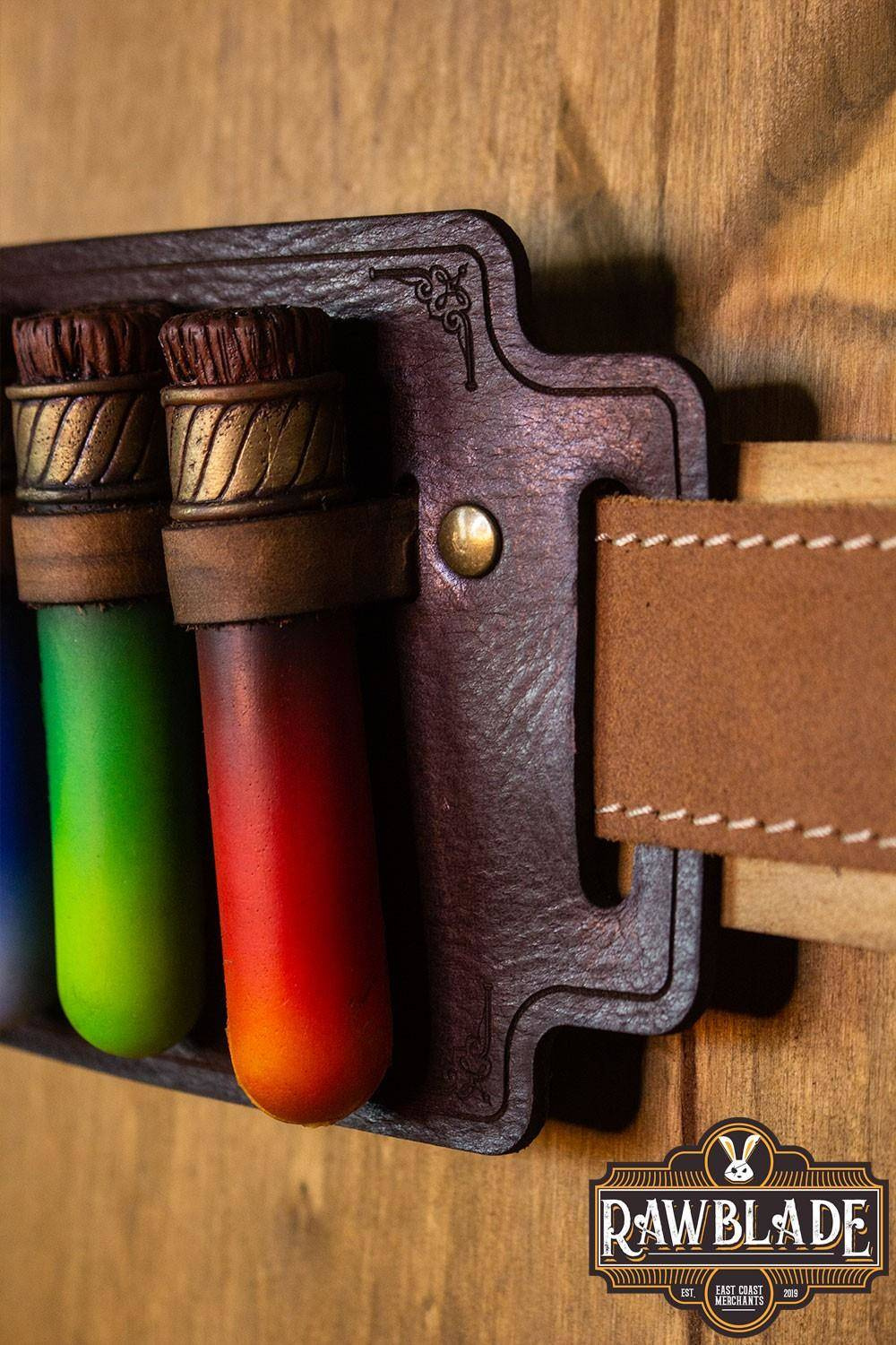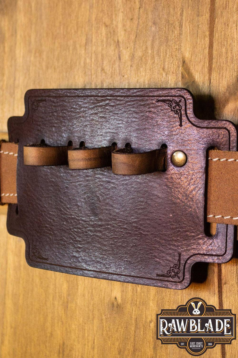 Potion Holder Lucius - smukły organizer na mikstury marki Rawblade to perfekcyjne połączenie praktyczności i elegancji. Wykonany z solidnej skóry o grubości 2 milimetrów, zdobiony nitami w kolorze mosiądzu i tłoczonym wzorem. Trzy pętle zaprojektowane specjalnie pod rzutki w kształcie fiolek. Etui przystosowane jest do pasów o grubości 2 mm i szerokości do 5 cm.