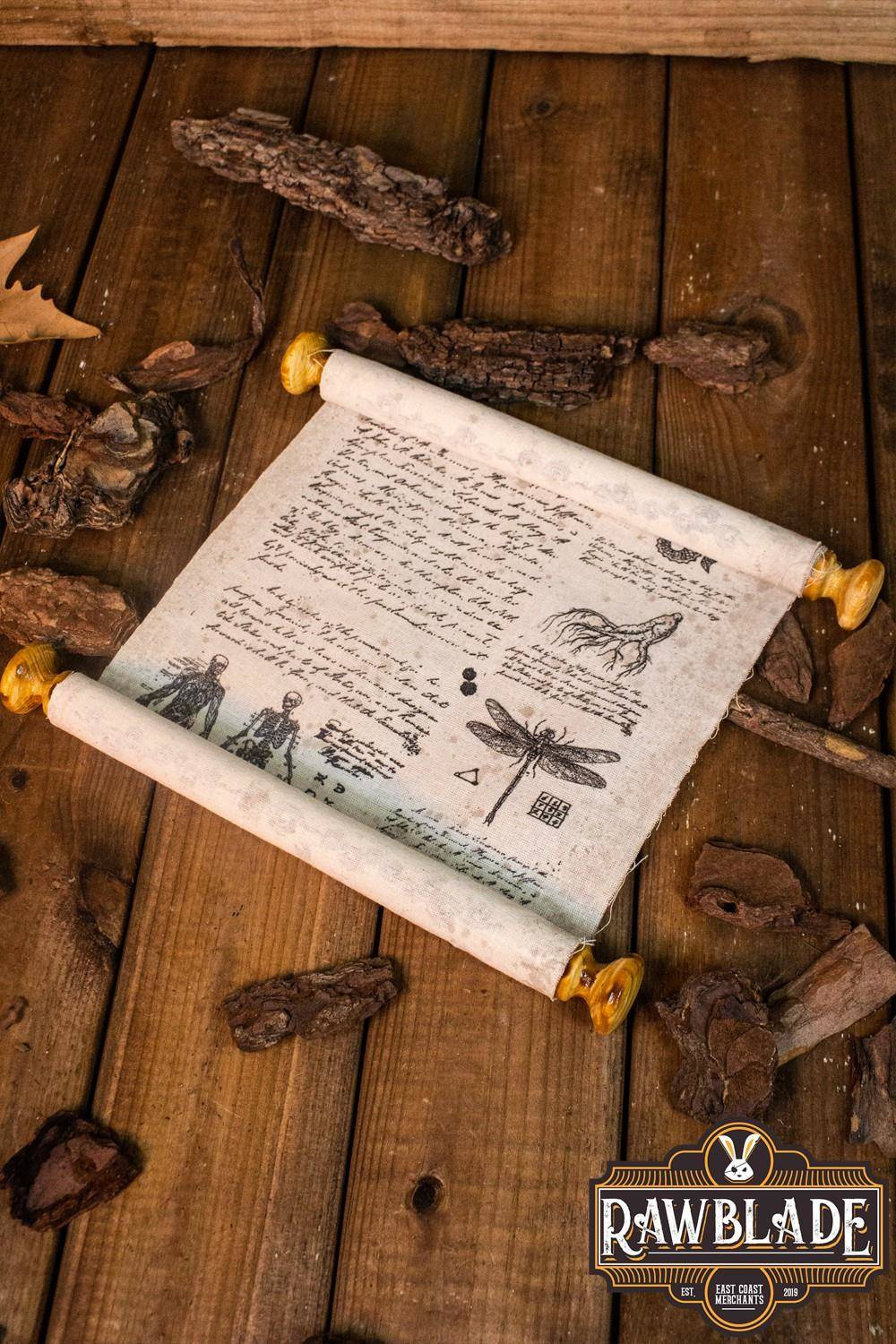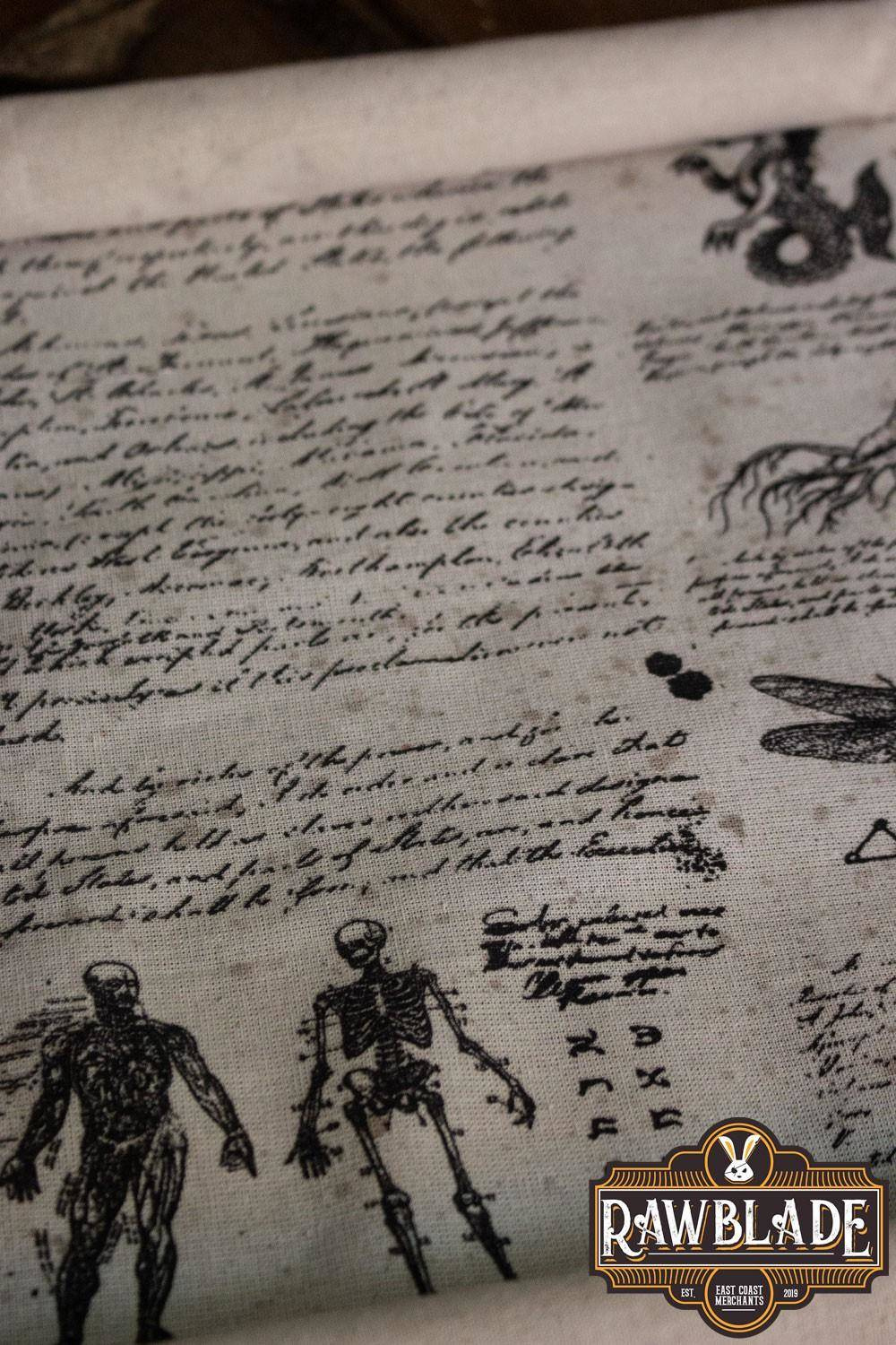 Każdy zwój jest całkowicie ręcznie wykonany z najwyższej jakości czystego lnu, co nadaje mu autentycznego i mistycznego wyglądu. Jego wyjątkowy design wypełniony jest mrocznymi i złymi rysunkami, które dodadzą charakteru twojej postaci.