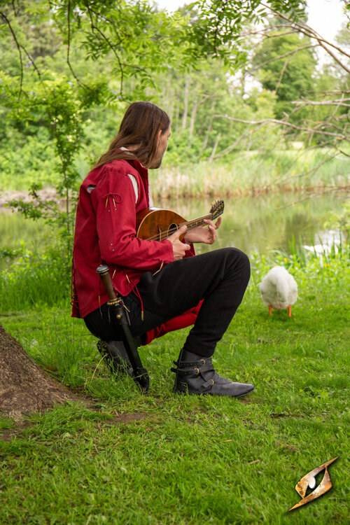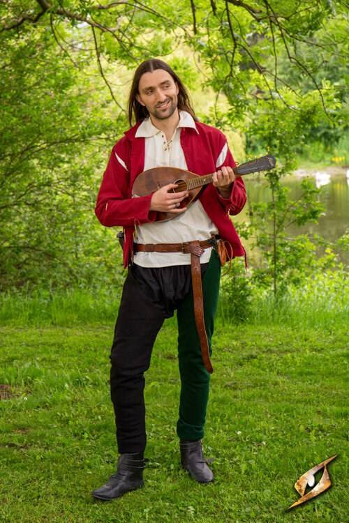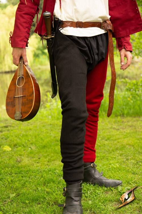 Średniowieczna nogawica (1 szt.), do przypięcia na pasie, wzorowana na ubiorze późnośredniowiecznym; wąska o charakterze rajstopo-spodni. Wykonana z wełny, solidnie uszyta.