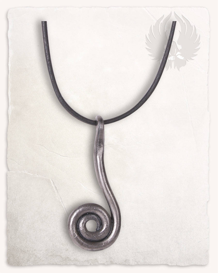 Mały wisiorek w kształcie spirali wykonany z kutego żelaza. Do wisiorka dołączony jest okrągły pasek z mocnej skóry, który można wykorzystać do noszenia go jako naszyjnik lub do przywiązania do paska lub sakiewki w celu ozdoby.