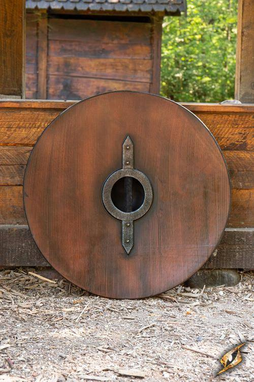 Tarcza okrągła w klasycznym stylu normańskim, stylizowana na drewnianą z żelaznym okuciem i wydatnym umbo. Uchwyt stanowi owinięty skórą imacz zamontowany wewnątrz umba.
