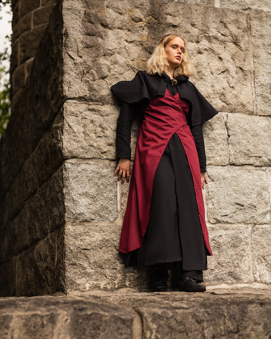 Można ją nosić na różne sposoby – w chłodniejsze dni doskonale prezentuje się z grubszą suknią z wełny, natomiast w cieplejsze z lekką, bawełnianą podszewką. Jej prosty, dopracowany krój sprawia, że pasuje do wielu postaci – od szlachcianek i kapłanek po elfie wędrowniczki.