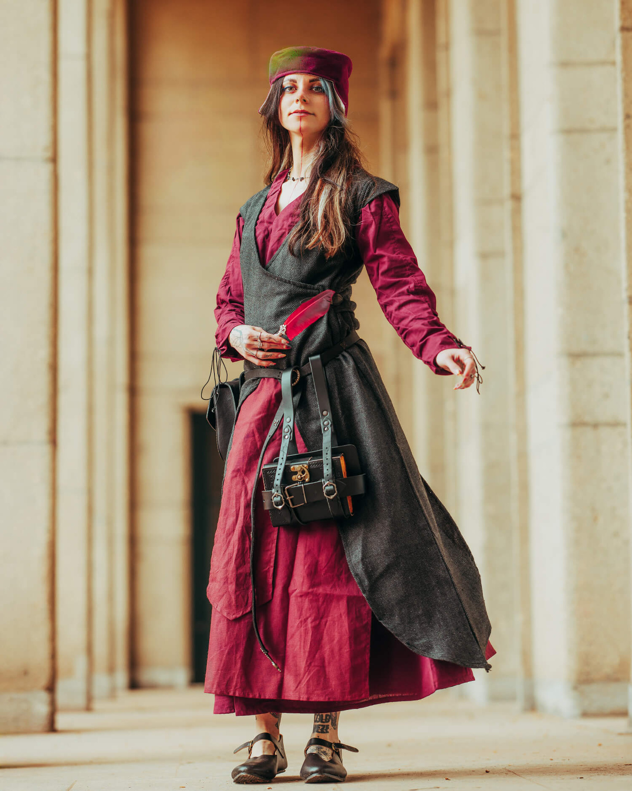 Suknię można nosić na różne sposoby – z lekką bawełnianą suknią spodnią w cieplejsze dni lub z grubszą, wełnianą, gdy temperatura spada. To uniwersalny element garderoby, który świetnie sprawdzi się w roli szaty czarodziejki, damy dworu czy elfiej łowczyni.