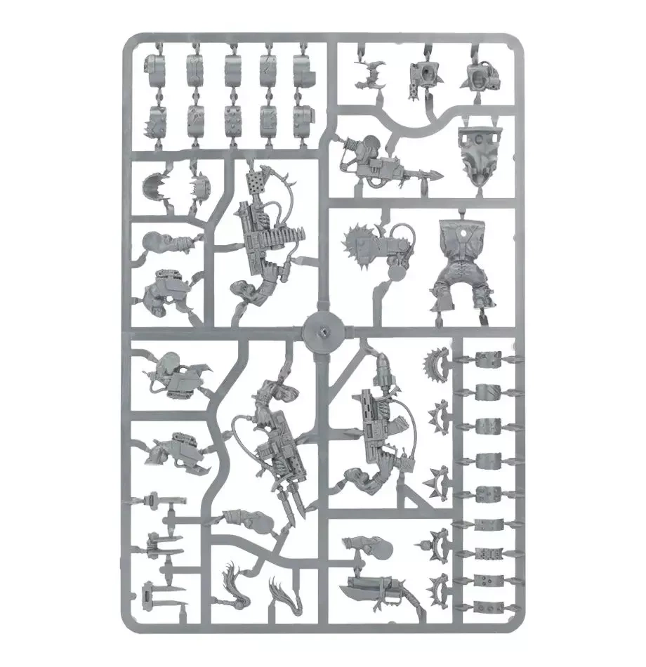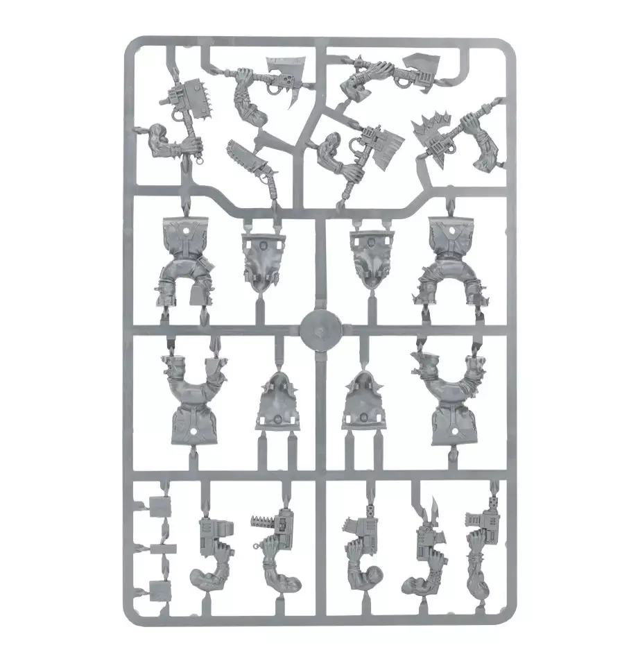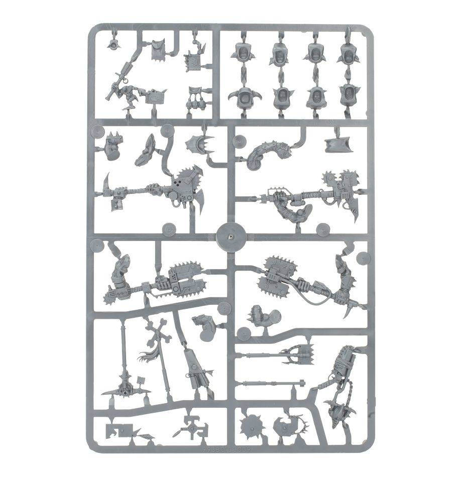 This box set contains five multi-part plastic Ork Nobz. This 104-piece set includes: 10 head variations, five different torso-fronts and five body variations allowing you to assemble a unique looking squad. Also included are a range of weapon options including: big choppas, power klaws, shoota/rokkit kombi-weapons, a shoota/skorcha kombi-weapon, sluggas and choppas. Additonally there are a host of extra components to allow you to further customise your squad, including parts to upgrade your Nobz with Cybork bodies and a Grot ammo runt. Models supplied with 32 mm round bases.