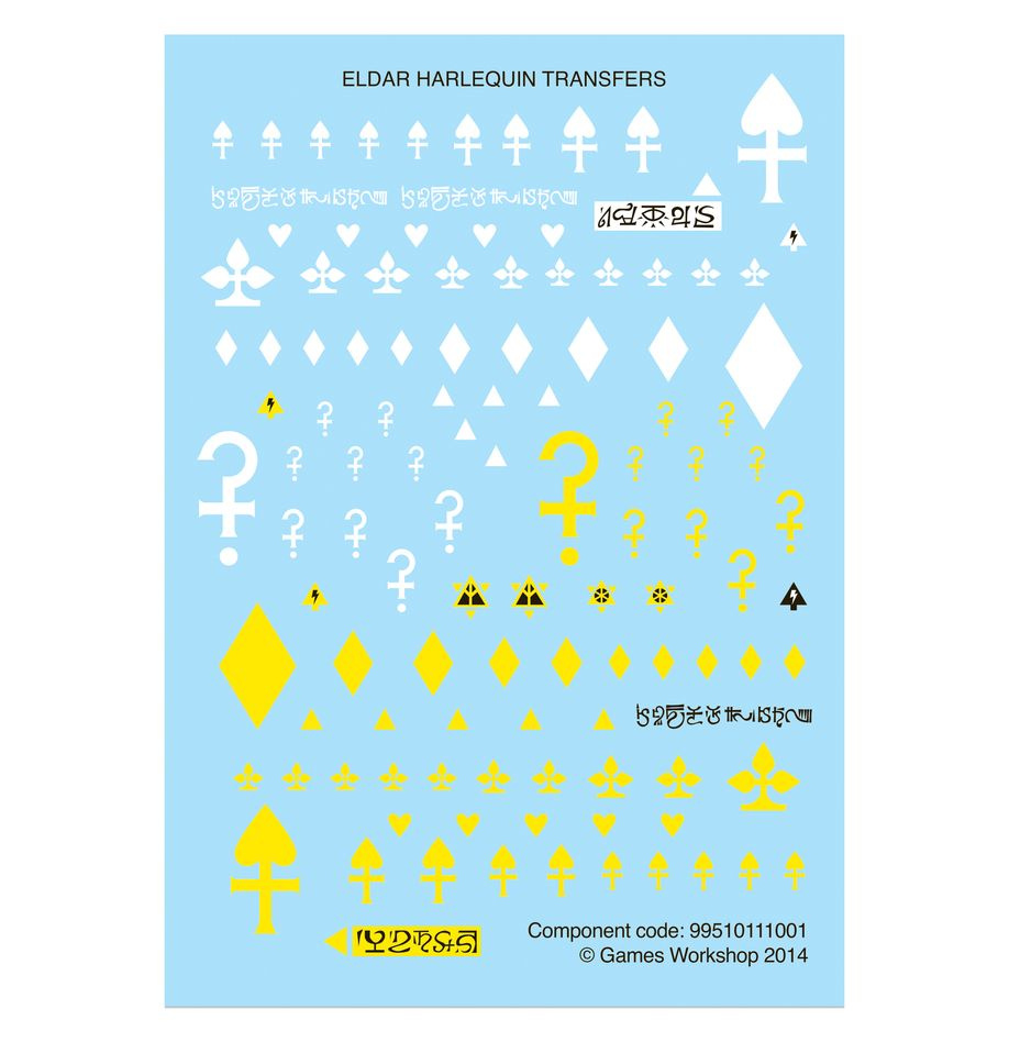Kalkomanie: Zestaw zawiera dwa arkusze kalkomanii Harlequins (łącznie 230 wzorów) w różnych rozmiarach, odpowiednich zarówno dla piechoty, jak i pojazdów.
