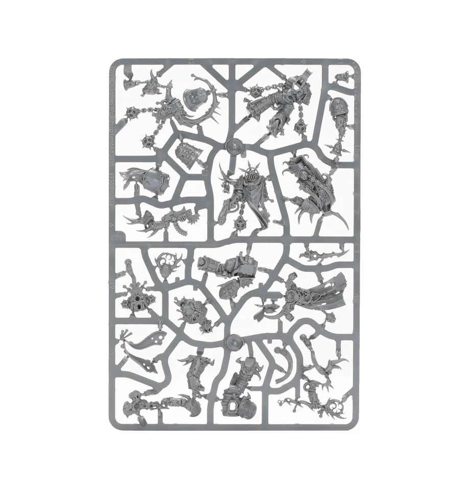 This 20-piece plastic kit makes one Malignant Plaguecaster, one Noxious Blightbringer, and one Plague Marine Plague Champion. It is supplied with one 40mm Citadel round base and two 32mm Citadel round bases.