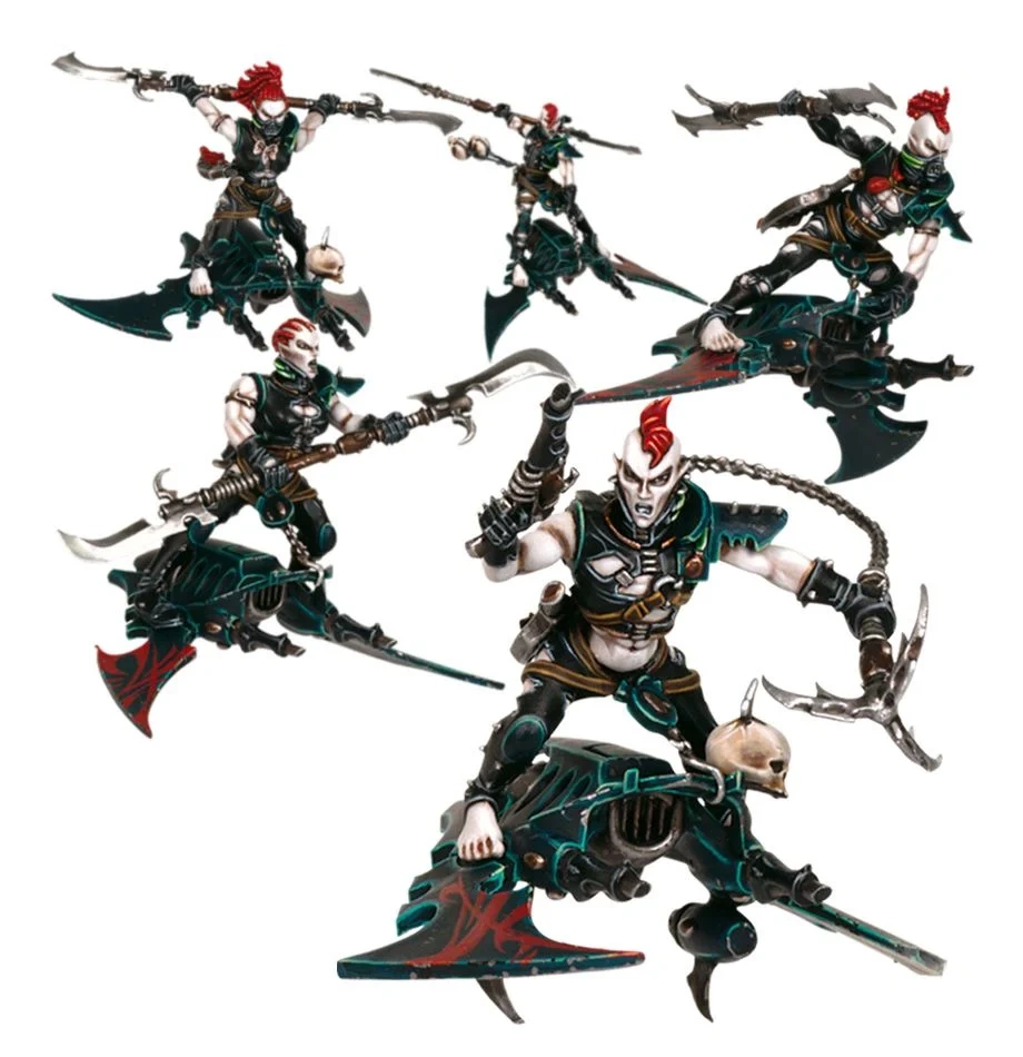 Hellions are airborne killers. Feral Drukhari, they descend upon their prey in a flurry of hooked blades before hurtling away to safety. Hellions ride to war upon skyboards, single-pilot anti-gravity boards, and pump their systems full of combat drugs. They are crazed terror troops who swoop into the midst of the foe, screaming curses and severing limbs with their murderously sharp hellglaives.