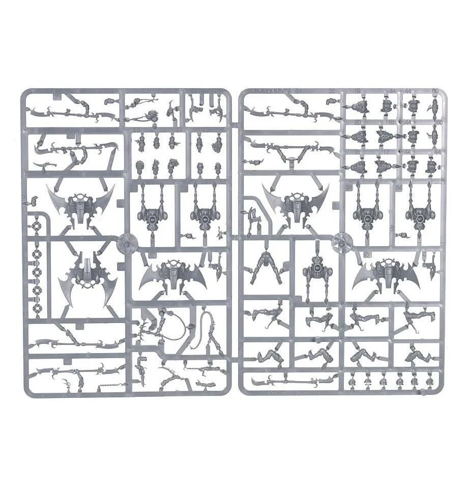 This box set contains five multi-part plastic Drukhari Hellions. This 83-piece set includes: three variations of skyboard, 10 different heads, five different bodies (three male and two female). Also included are weapon options including Hellglaives and an agoniser. Models supplied with small flying bases.