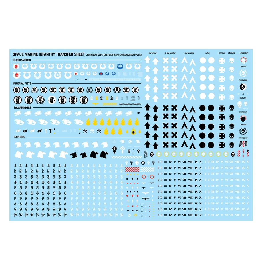 • Kalkomanie: 1x Arkusz Kalkomanii Space Marine Infantry z 758 wzorami. Zawiera ikony Chapterów (Ultramarines, Imperial Fists, Salamanders, Raptors), wskaźniki roli bojowej, numery i cyfry.