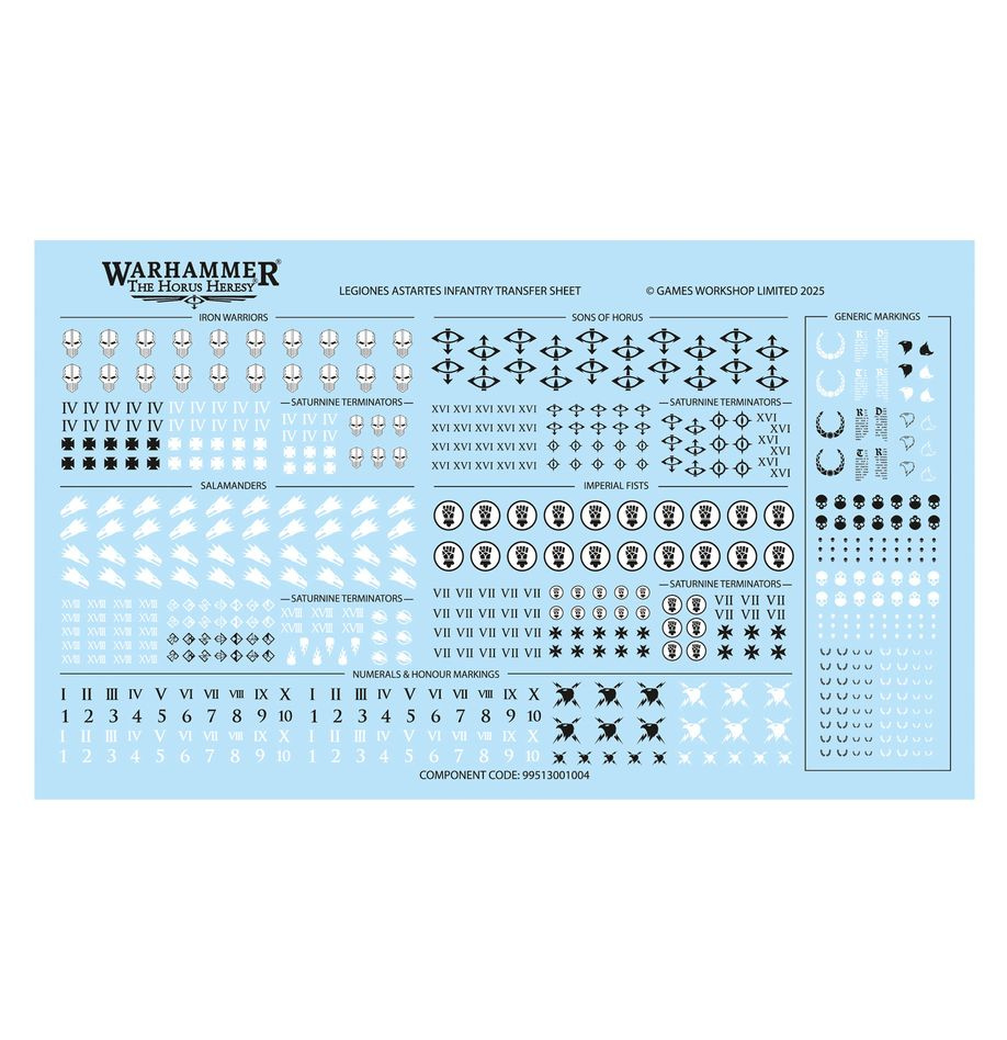 W zestawie znajdziesz arkusz kalkomanii z 618 wzorami, w tym ikonami Sons of Horus, Imperial Fists, Iron Warriors i Salamanders, a także ogólnymi insygniami i numerami.