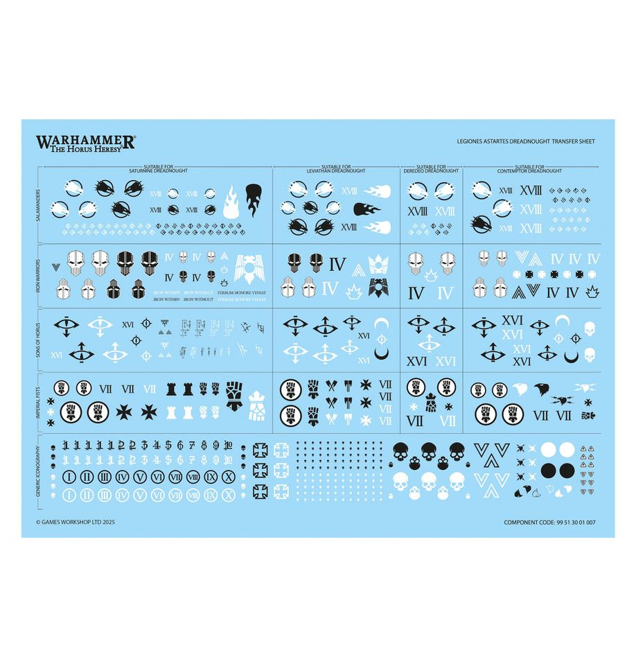 1x arkusz transferowy Horus Heresy Dreadnought (528 wysokiej jakości kalkomanii) z ikonografią Legionów: Sons of Horus, Imperial Fists, Iron Warriors i Salamanders.
